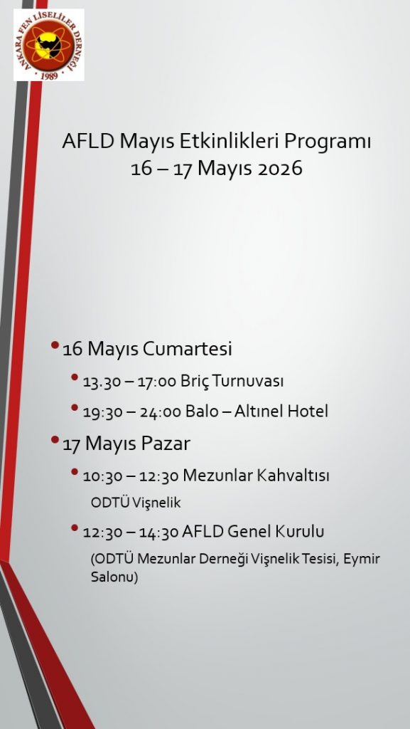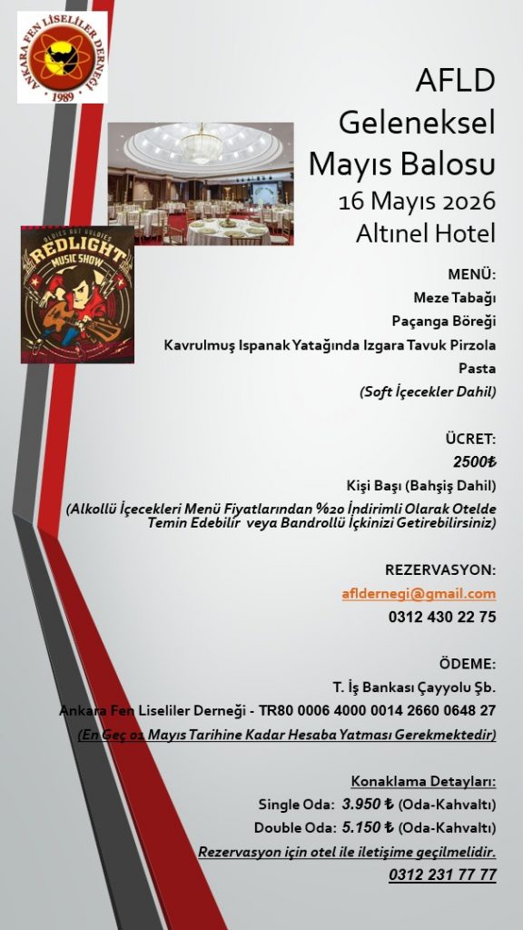 Geleneksel Mayıs balomuz bu yıl 24 Mayıs Cumartesi akşamı saat 19.00’da Altınel Ankara Hotel’de yapılacaktır. Detaylar ve kayıt için bu bağlantıyı ziyaret ediniz.